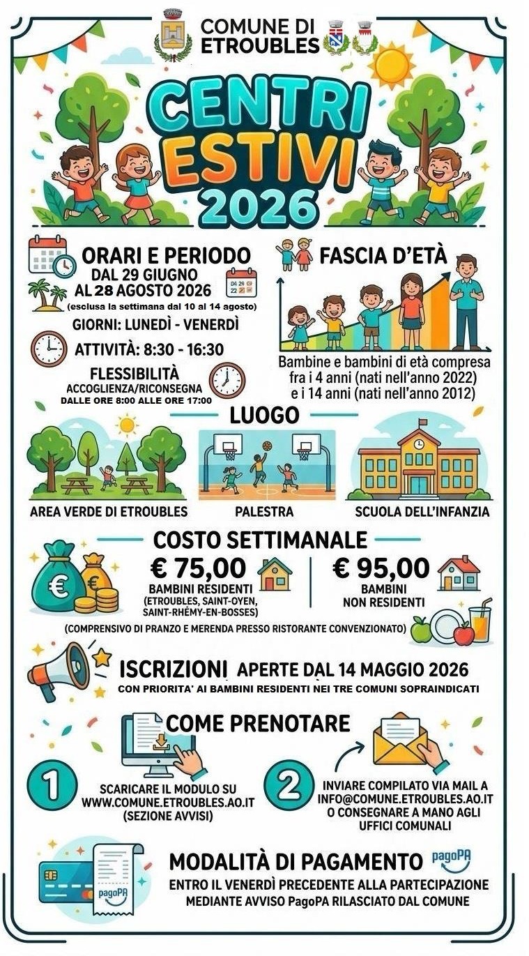 - Costo settimanale comprensivo di pranzo e merenda in locale convenzionato: € 75 residenti a Etroubles, Saint-Oyen- Saint-Rhémy-en-Bosses ; €95 non residenti